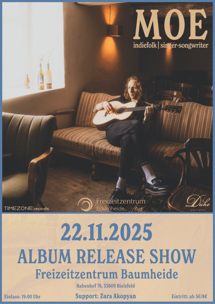 Der ostwestfälische Singer-Songwriter Moe alias Moritz Herrmann hat zum Pre-Releasekonzert seines neuen Albums „The Night Ain’t Calling My Name Anymore“ ins FZZ Baumheide Bielefeld eingeladen. Der Abend gestach mit viel Musik und Geschichten rund um die am 28.11.2025 erscheinende fünfte Veröffentlichung des gebürtigen Bielefelders.