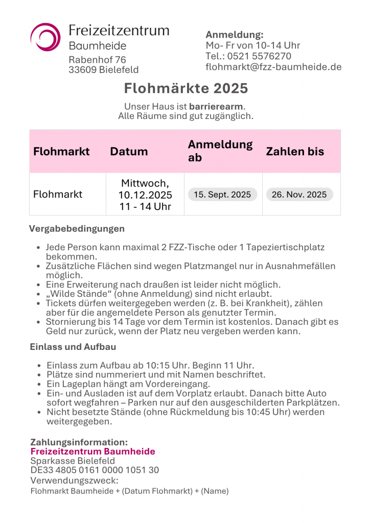 Das Freizeitzentrum Baumheide lädt zum Flohmarkt im großen Saal ein. Rund 50 Verkaufsstände bieten eine bunte Auswahl an Trödel, Raritäten und Schnäppchen.