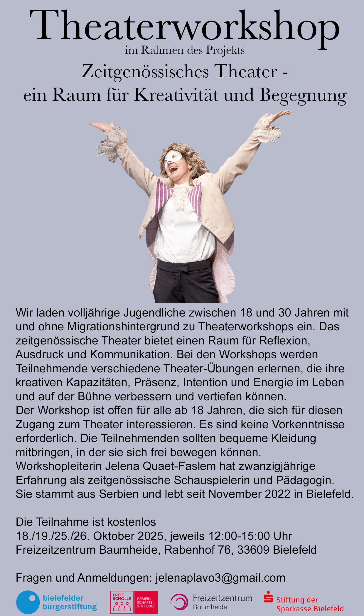 Theaterworkshop – Zeitgenössisches Theater – ein Raum für Kreativität und Begegnung Eintrittspreis kostenlos + Zu Google Kalender hinzufügen + iCal / Outlook exportieren Schlagwörter:jugendliche, junge erwachsene, kostenlos, mitmachen, theaterworkshop, workshop Datum 18.10.2025 Uhrzeit 12:00 - 15:00 Besonderheiten kostenlos,Theater Raum Gymnastikhalle Webseite https://fzz-baumheide.de/raeume/gymnastikhalle/ Die Gymnastikhalle erreichen Sie über den Seiteneingang an der Stauferstr. gegenüber dem ALDI. Der Eingang liegt oberhalb des Tiefhofs direkt hinter der Calisthenics-Anlage Kategorien Kurse / WeiterbildungTheaterVeranstaltungen Veranstalter FZZ Baumheide Telefon +495215576270 E-Mail info@fzz-baumheide.de Eintrittspreis kostenlos