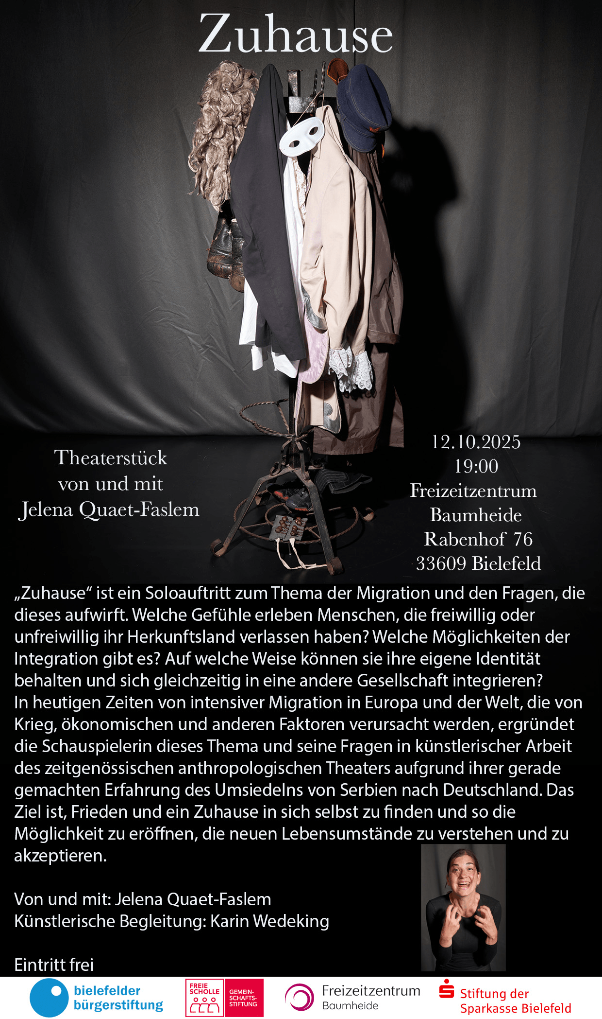 Flyer Theaterstück "Zuhause"Zuhause – Theaterstück von und mit Jelena Quaet-Faslem